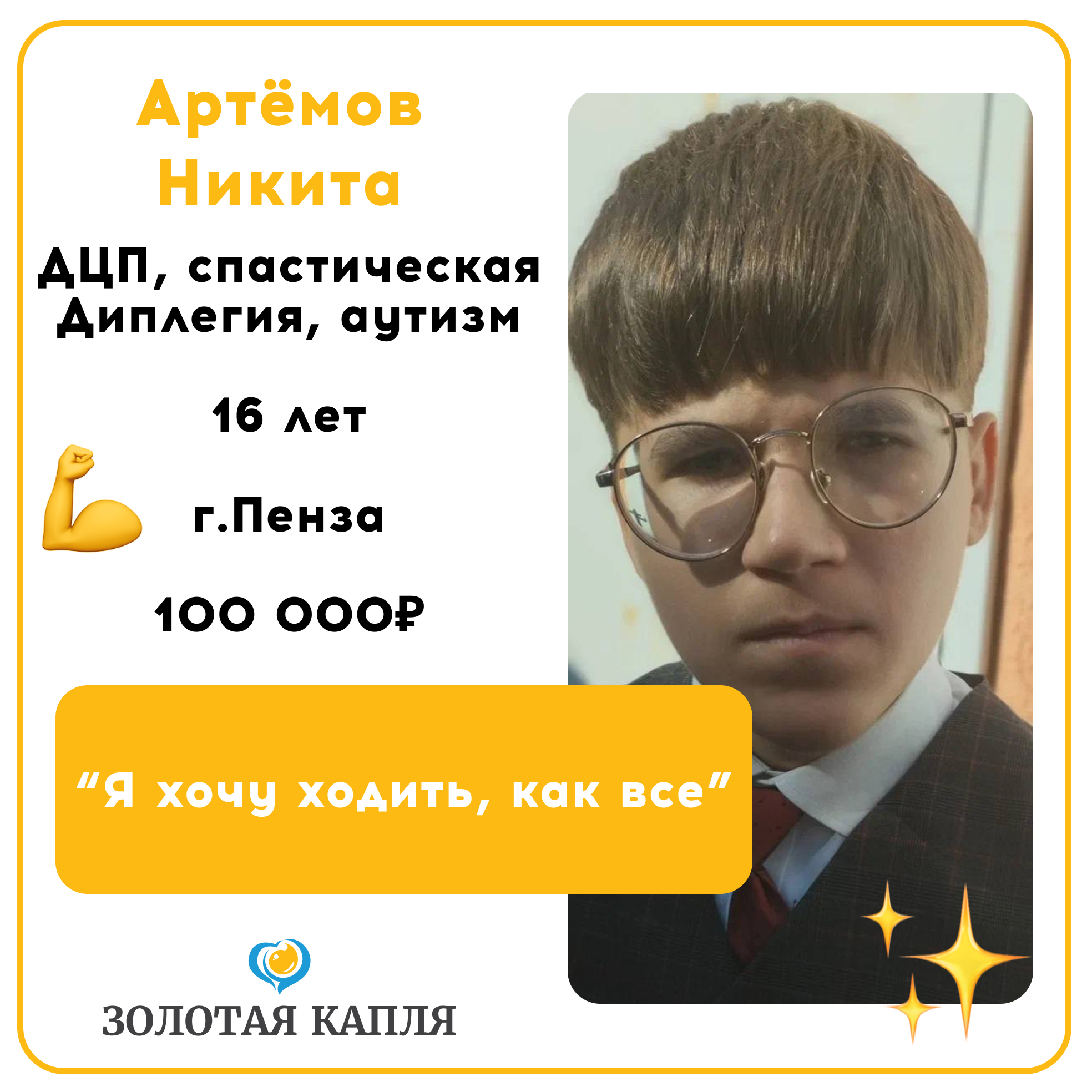 Родился здоровым, но после прививки АКДС в 4 месяца состояние резко ухудшилось. Диагнозы: ДЦП (спастическая диплегия) и аутизм. Ходит на носочках, нарушена координация. С возрастом стало тяжелее: Никита набрал вес, а мышцы не справляются. Учится в 7 классе, но каждый поход в школу - испытание. Без реабилитации он может потерять возможность ходить.