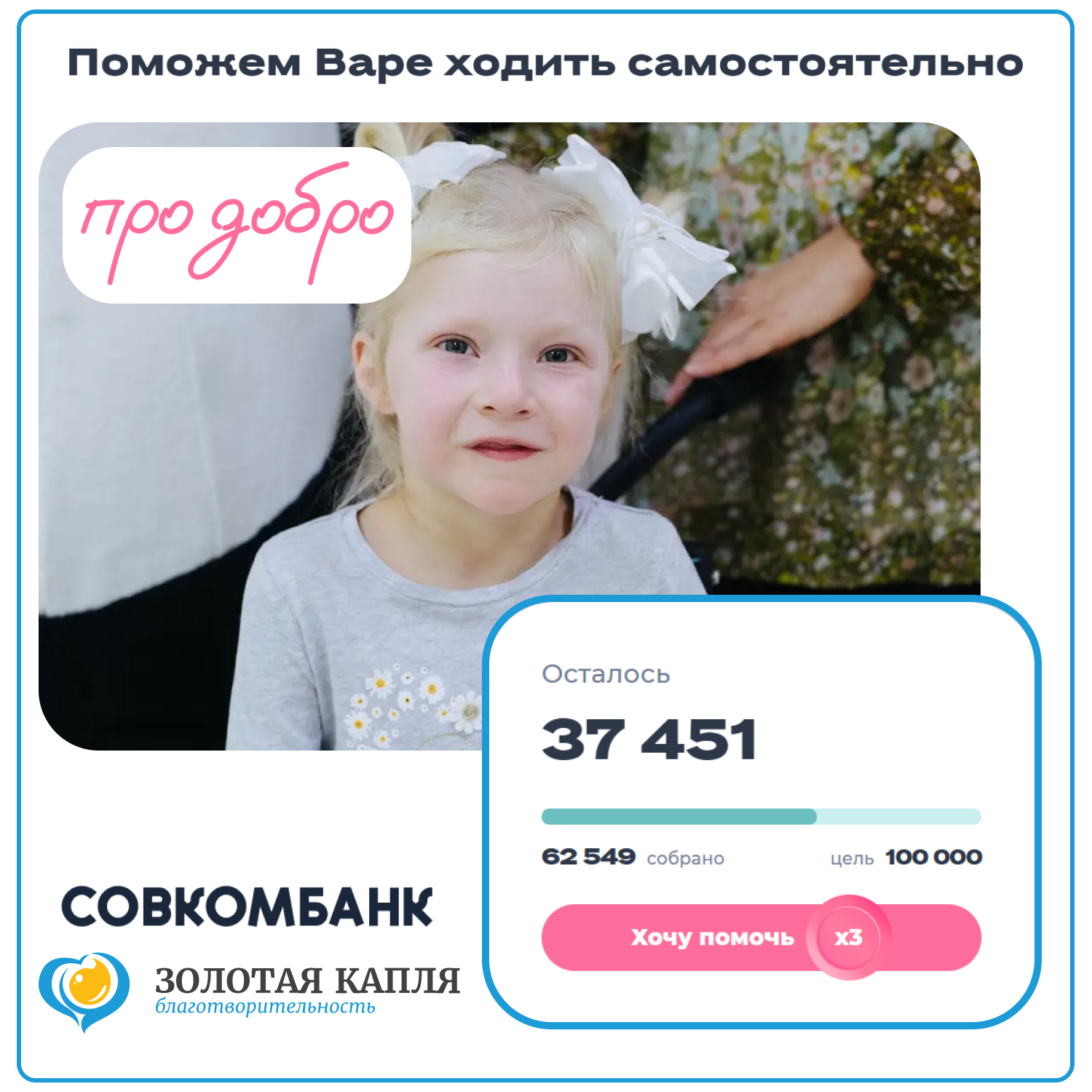 На платформе "продобро" от Совкомбанка открылся сбор для нашей маленькой подопечной - Вари Сенюткиной (https://prodobro.ru/projects/pomojem-vare-hodit-samostoyatelno).