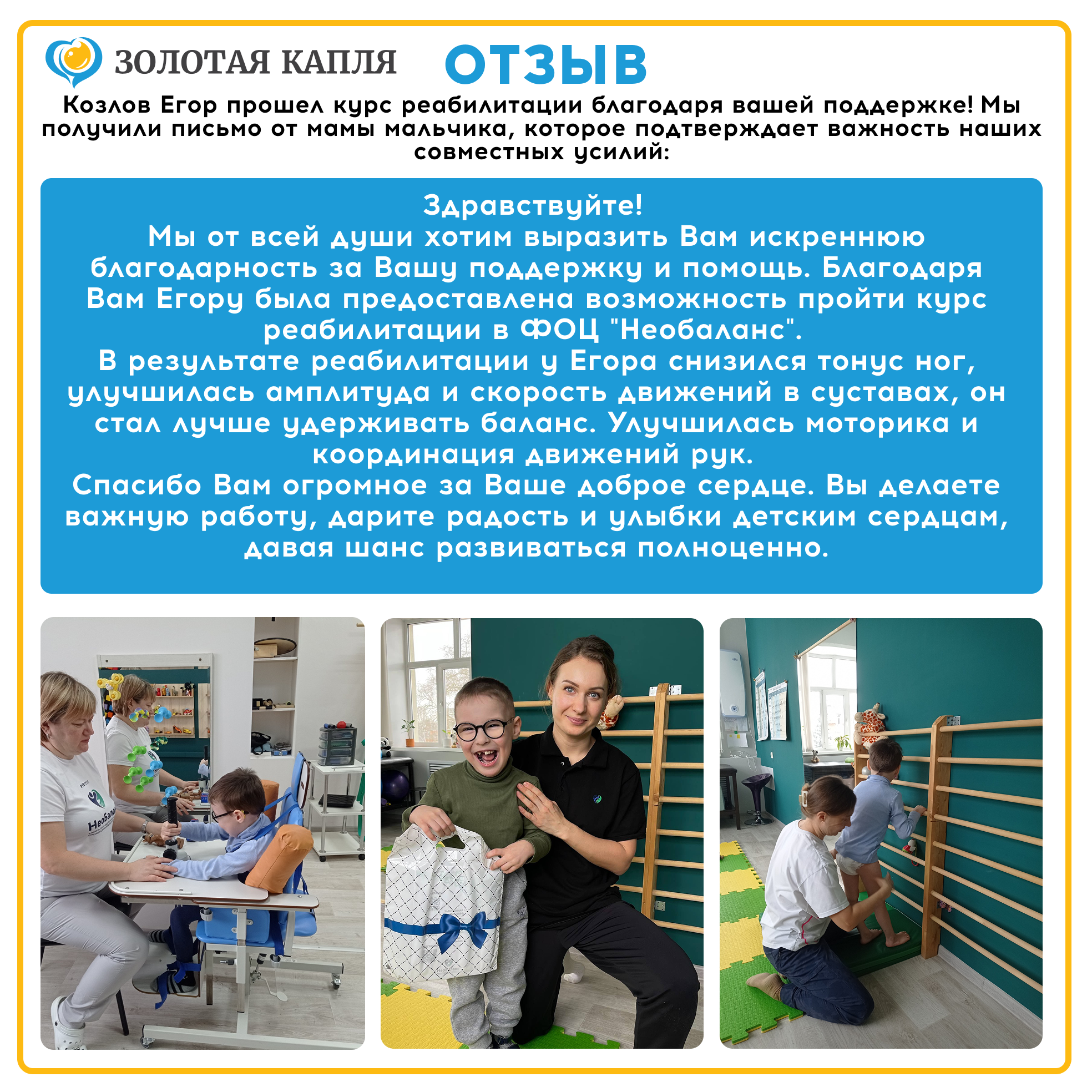 Друзья, благодаря вашей поддержке и неравнодушию наш подопечный Козлов Егор прошёл курс реабилитации. Каждый новый шаг, каждое умение давались нелегко, но результат превзошёл ожидания! Но мы не можем останавливаться. Пока Егор радуется успехам, другие дети всё ещё ждут своей очереди на реабилитацию. Им очень нужны деньги на лечение. Давайте подарим шанс каждому. Пусть история Егора вдохновит вас на доброе дело.