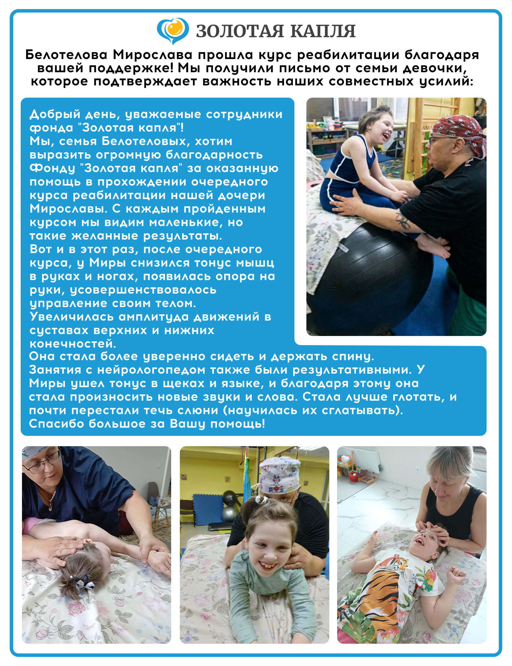Друзья, радостная новость: благодаря вашим пожертвованиям наша подопечная Белотелова Мирослава прошла курс реабилитации. На картинке - фото Мирославы и трогательный отзыв от её семьи. Позади много труда, слёз и терпения, но результат того стоил! Но другие дети всё ещё ждут своей реабилитации. Им так же нужны ваша поддержка и вера в чудо. Пожалуйста, не проходите мимо. Любая сумма приближает детей к здоровой жизни.