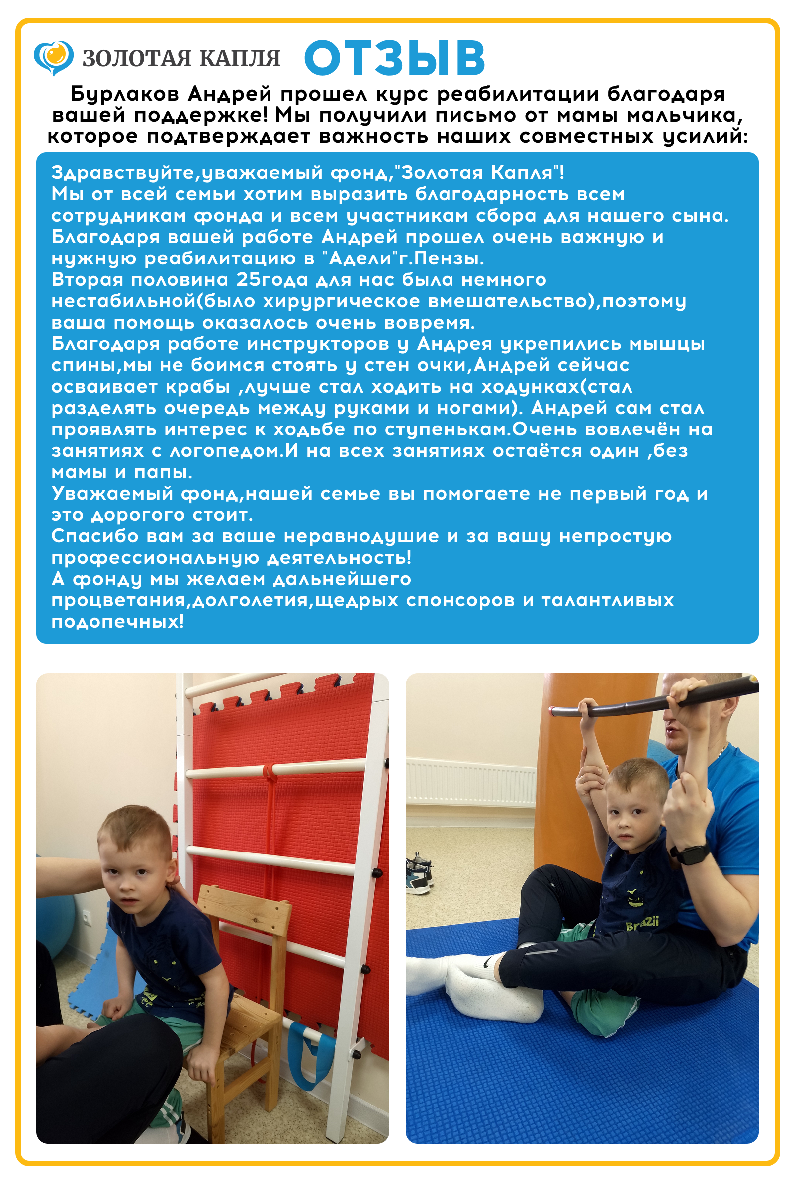 Наш подопечный Бурлаков Андрей прошёл курс реабилитации - и всё благодаря вашим пожертвованиям!